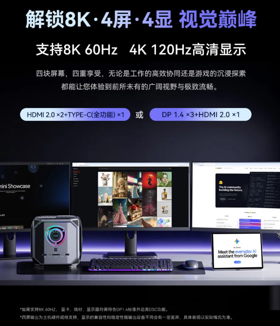 其中,DP和最左侧的HDMI直连GPU,游戏玩家要优先使用它们连接显示器。需要注意的是,7个视频接口不能同时使用,最多可以接驳4台8K显示器,实现4屏异显。