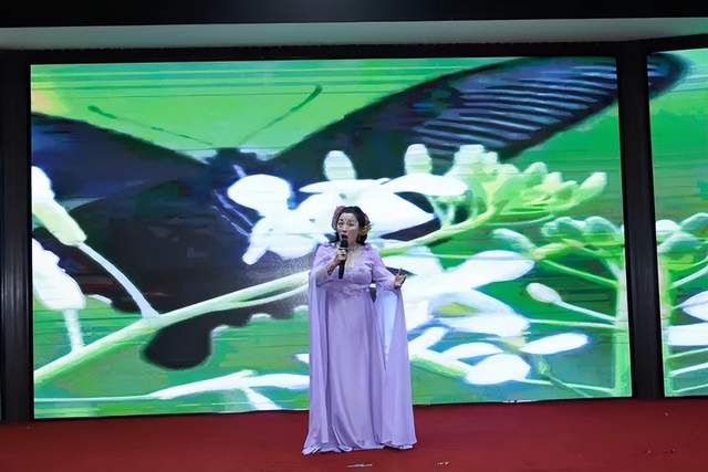 女高音独唱《春天的芭蕾》由多才多艺的女高音、作家、编剧兼导演陈渔演唱,虽然在排练时她对话筒调音效果不够满意,但是一旦进入歌唱状态,她全身心融入了甜美的歌声、悠扬的旋律、饱满的激情、圆舞曲的节奏之中,很快把听众带入春风拂面、遍地花开的春天,把台下观众的情绪调动起来。
