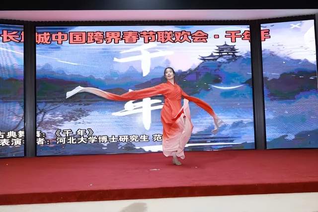 古典舞《千年》由河北大学博士研究生范美琳表演,她是一位古汉语在读博士研究生,一位文艺爱好者,她跳的是水袖舞,水袖讲究身韵合一,身姿摇曳,神韵必备,技法神韵都十分重要。中国古典舞借鉴和继承了戏曲舞蹈独特、鲜明的风格和形态。伴随着《千年》的歌曲,她眼睛时而陶醉,时而迷离,时而远望,把中国古典舞的快动作与中国戏剧中的慢动作相结合,飞身甩袖,起承转合,动静适宜,像一枝风中摇曳的垂柳,一面迎风飘扬的旗帜,一个灵魂优雅如天女般的舞者仿佛穿越千年的时空来到人间,用纯净的舞蹈肢体语言与观众的审美情趣产生共鸣。