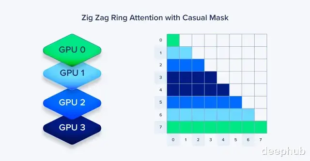 GPT 这类自回归模型有个额外的麻烦:Token 只能看前面的 Token不能看后面的。所以会导致负载不均衡有些卡会空转,Zig-Zag Ring Attention 解决这个问题的办法是交错分配,不是按顺序切块而是 GPU 0 拿 Token [0, 4, 8...],GPU 1 拿 [1, 5, 9...],以此类推。每张卡都拿到早期和晚期 Token 的混合,因果注意力计算时负载就均衡了环里不会有卡闲着。