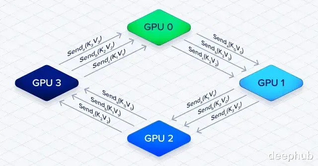 关键在于计算和通信是重叠的。GPU 1 拿着当前的 K/V 分块算注意力的时候,同时在从 GPU 0 接收下一批分块。通信延迟减少了,因为不用干等数据全到了再开算。
