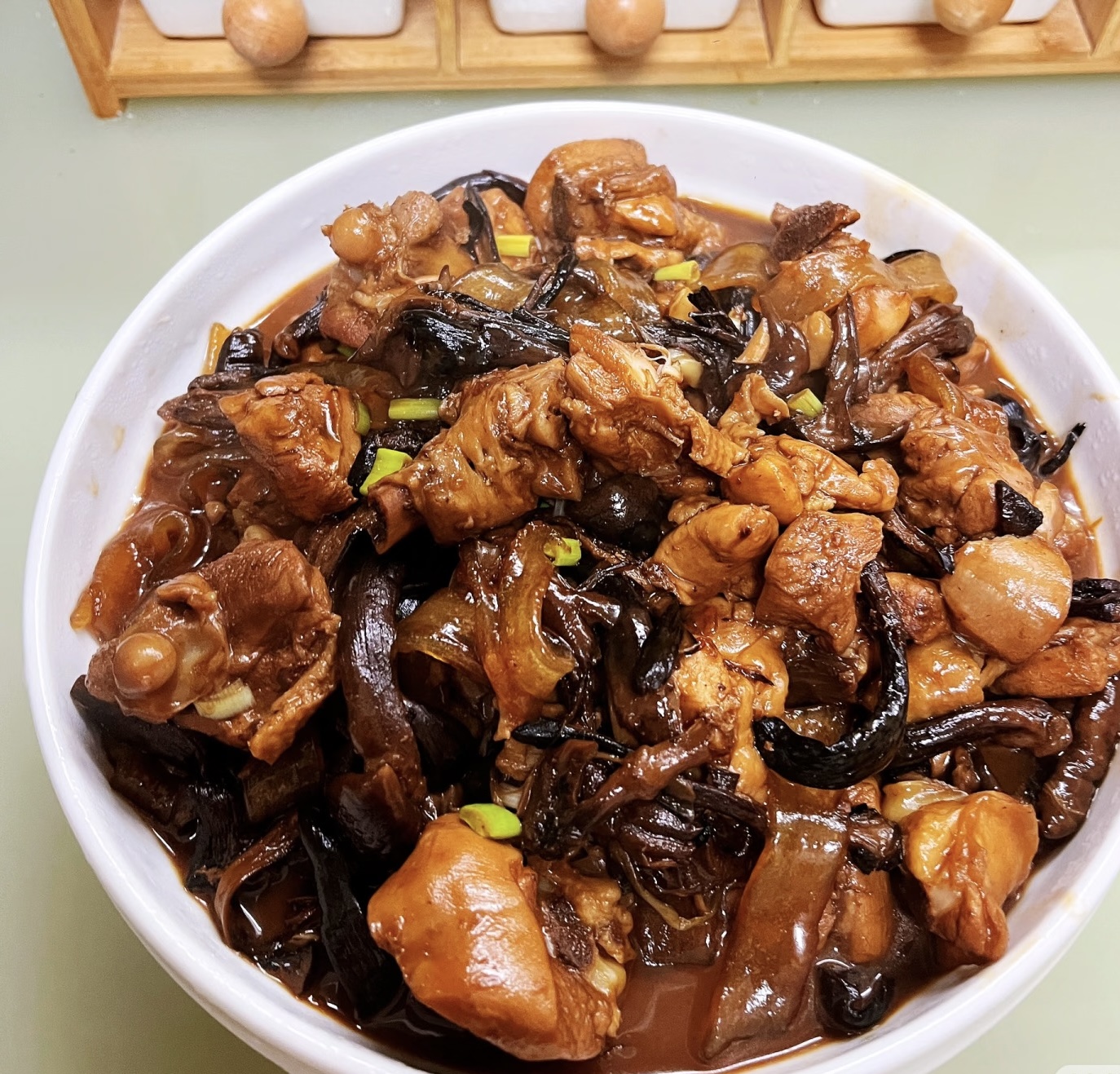 最后,撒入一把新鲜葱花,点少许味精提鲜(也可不加),轻轻翻匀即可关火。不必收得太干,留一些浓汤,才是这道菜的精华所在。盛一碗热米饭,将鸡肉、蘑菇、粉条连汤带汁浇上去,轻轻一拌,米饭裹满酱香,入口温润满足。若再配上一张刚出锅的玉米饼子,蘸着汤汁吃,便是人间至味。