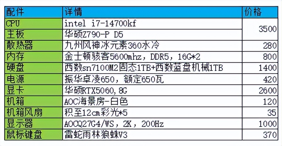 按照老铁的说法,主机他基本是按照我写的配置买的,有两个配件稍微换了下品牌和型号,电源换了一个稍微便宜点的鑫谷,固态硬盘用了国产致钛。显示器和鼠标键盘也没用我的,都稍微降了点档次。自己在网上买好配件之后又花100块找了个上门装机的,最终9000多块拿下。