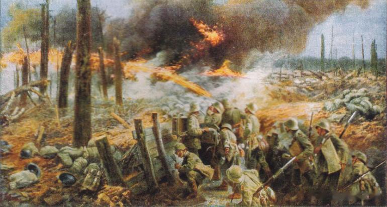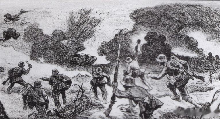 暴风突击队遭遇坦克的绘画,手握工兵锹、手榴弹、轻机枪、以及火焰喷射器的士兵冲向英军坦克。