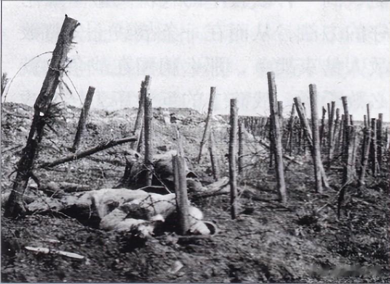 德军堑壕外布置了多种铁丝网,这是被炮击摧毁部分铁丝网之后,迅速补充铺设的结果。