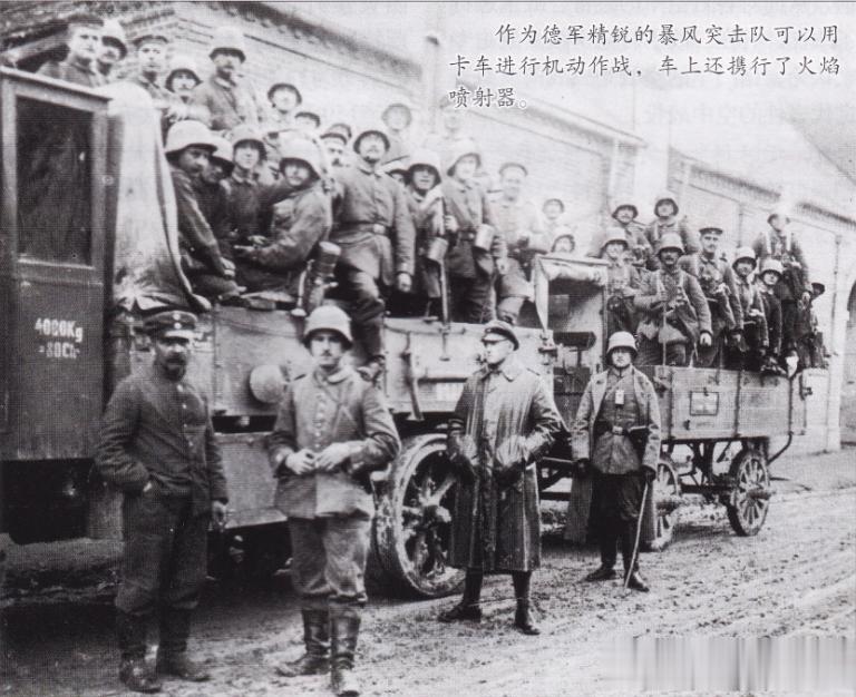 作为德军精锐的暴风突击队可以用卡车进行机动作战,车上还携行了火焰喷射器。