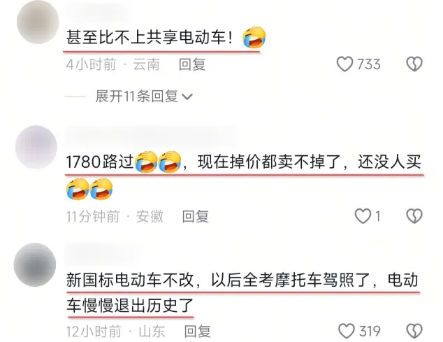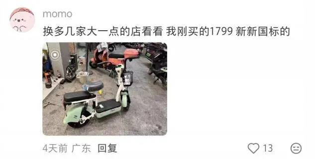 也有网友@momo表示,自己刚买到的新国标电动车,啥都有,而且才1799元。