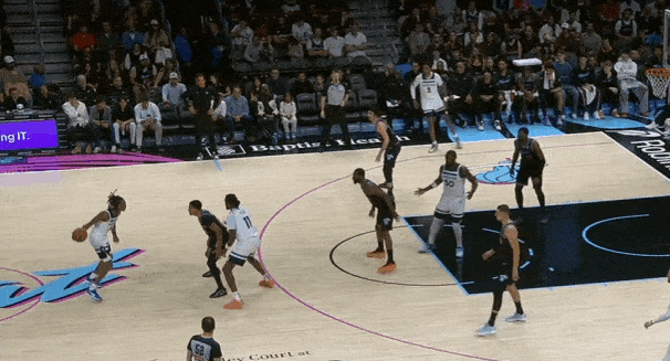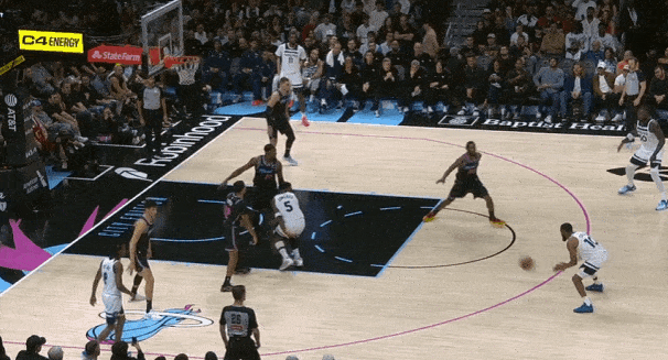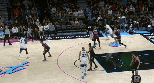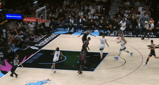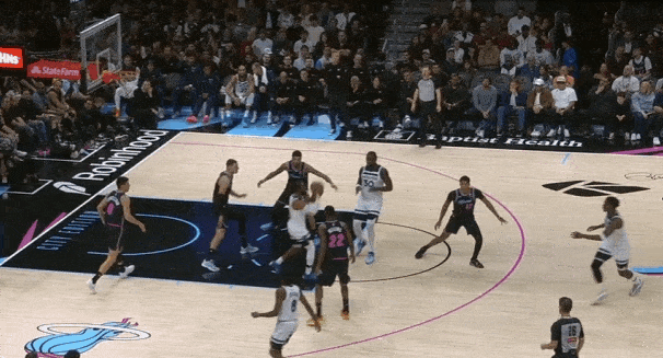 热火联防,兰德尔持球突破行进至肘区背转身吸引协防,随后立即找到强侧底角的里德。