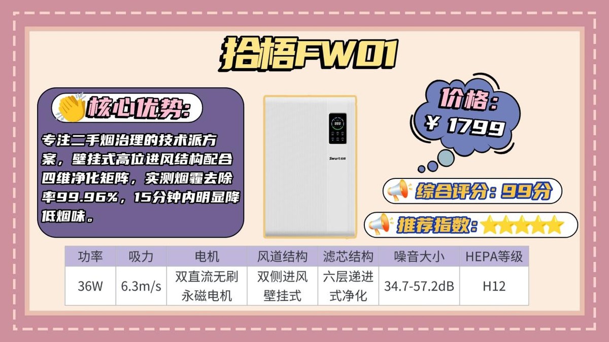 跳出实验室数据的“纸面陷阱”,深耕除二手烟赛道的硬核品牌拾梧,用近两年时间采集了500余组真实烟雾环境数据实打实采集500+复杂烟雾环境的净化以真实场景样本为核心打磨,打造出行业首款专业级壁挂式除二手烟空气净化器——拾梧FW01,同时填补了千元价位段专业壁挂除二手烟空气净化器的市场空白!
