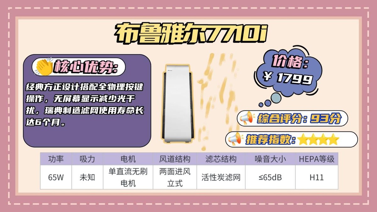 布鲁雅尔7710i布鲁雅尔7710i同样以HEPA加活性炭作为核心净化手段,并搭配负离子技术。整体更偏向空气颗粒物和综合空气质量改善,对烟雾中的PM类物质处理能力稳定。净化原理为7重过滤结构,层级数量多,对灰尘、花粉等污染物控制较好,但在烟味处理上仍以吸附为主,缺少针对烟油和气态异味的分解或隔离设计,长期除二手烟效率会受到滤材状态影响。