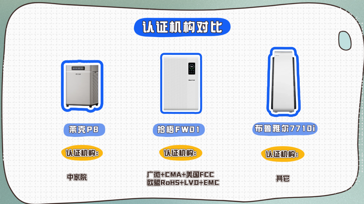 测评前言2026除烟味空气净化器推荐买哪一款?在除烟味空气净化器这类需要长期运行的家电上,认证与检测并非装饰项,而是安全、电磁兼容和使用合规性的基础门槛。尤其是除二手烟场景,空气净化器往往需要高功率、长时间运行,对整机稳定性和用电安全要求更高。这一部分不讨论净化效率,只看三款机型在权威认证和检测体系上的覆盖情况。