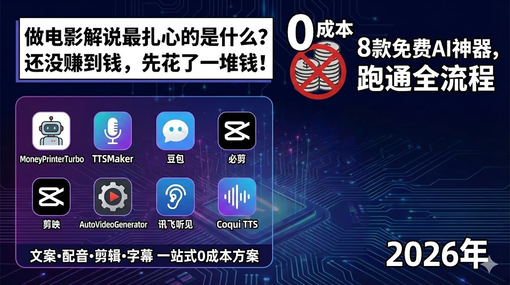 我实测了8款免费电影解说工具,覆盖文案生成、AI配音、视频剪辑、字幕识别全流程,帮你搭建一套0成本的电影解说工作流。
