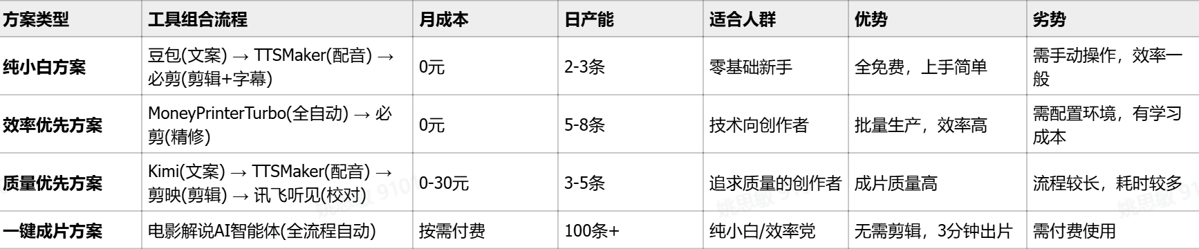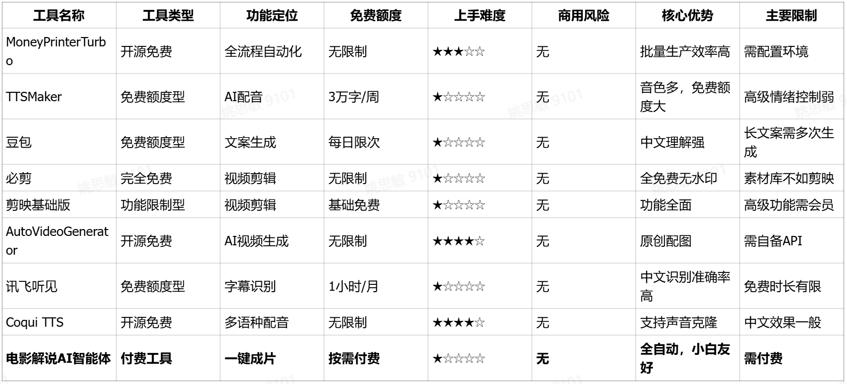 1.1 免费工具的三种类型类型特点代表工具完全免费开源无任何限制,可商用MoneyPrinterTurbo、Coqui TTS免费额度型每周/每月有免费额度TTSMaker、讯飞听见功能限制型基础功能免费,高级付费剪映、度加1.2 评估免费工具的4个维度在选择之前,问自己四个问题: