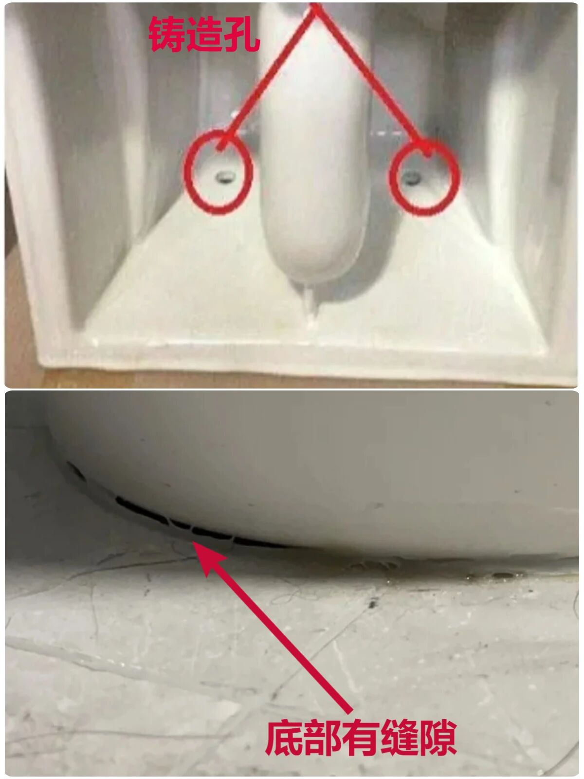 ▲马桶底部一圈的和铸造孔(不是所有马桶都有)玻璃胶没有密封处理,产生的水会流入马桶底部,长时间就会腐蚀法兰圈,堆积过多污水,产生异味顺着缝隙飘出来。解决办法