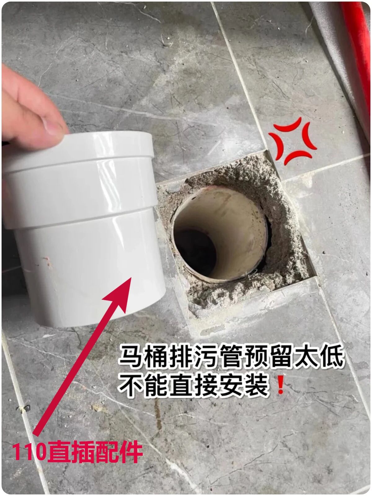 ▲解决也很简单,购买110内插直接管,内壁涂PVC专用胶,花小钱解决大问题至少是平于瓷砖面1cm。管壁与瓷砖未封堵