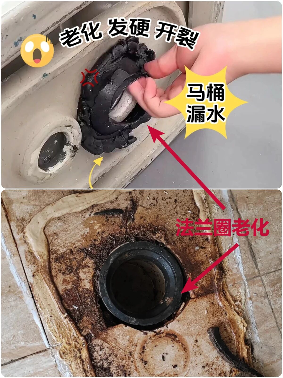 ▲马桶与下水管连接需要用到法兰密封圈,老化或者密封性不行的话,臭气就会往上反臭味, 因为一直被压在马桶下面比较隐蔽,只有挪开马桶才能检查。解决办法