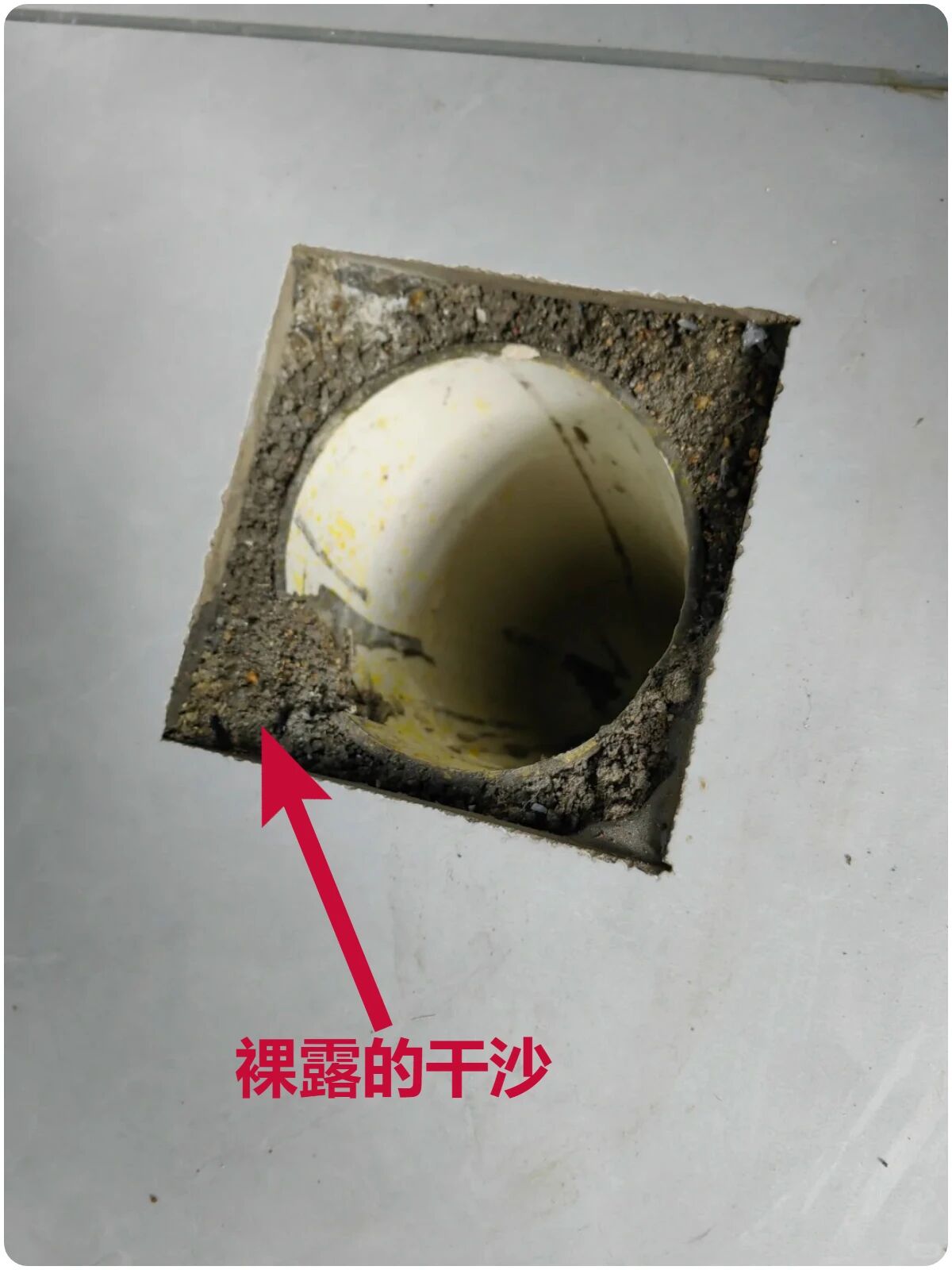 ▲瓷砖与排污管之间的干沙,安装马桶时不去处理,产生的污水会顺着干沙渗入瓷砖下部,久而久之整个卫生间都会臭气弥漫,有些家庭卫生间地面都是臭的原因。解决办法