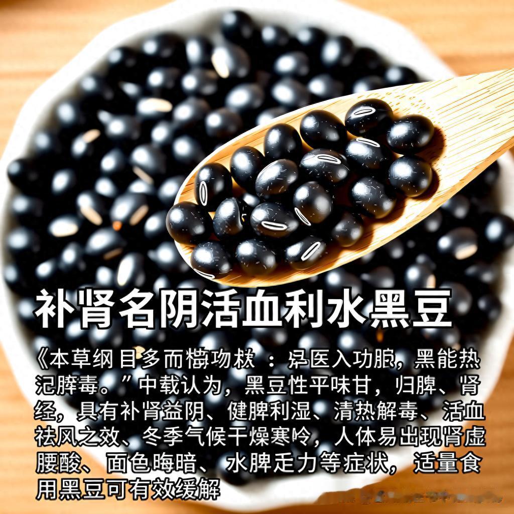 黑豆,又名乌豆、黑大豆,是豆科植物大豆的黑色种子。《本草纲目》记载:“黑豆入肾功多,故能治水、消胀、下气、制风热而活血解毒。”中医认为,黑豆性平味甘,归脾、肾经,具有补肾益阴、健脾利湿、清热解毒、活血祛风之效。冬季气候干燥寒冷,人体易出现肾虚腰酸、面色晦暗、水肿乏力等症状,适量食用黑豆可有效缓解。