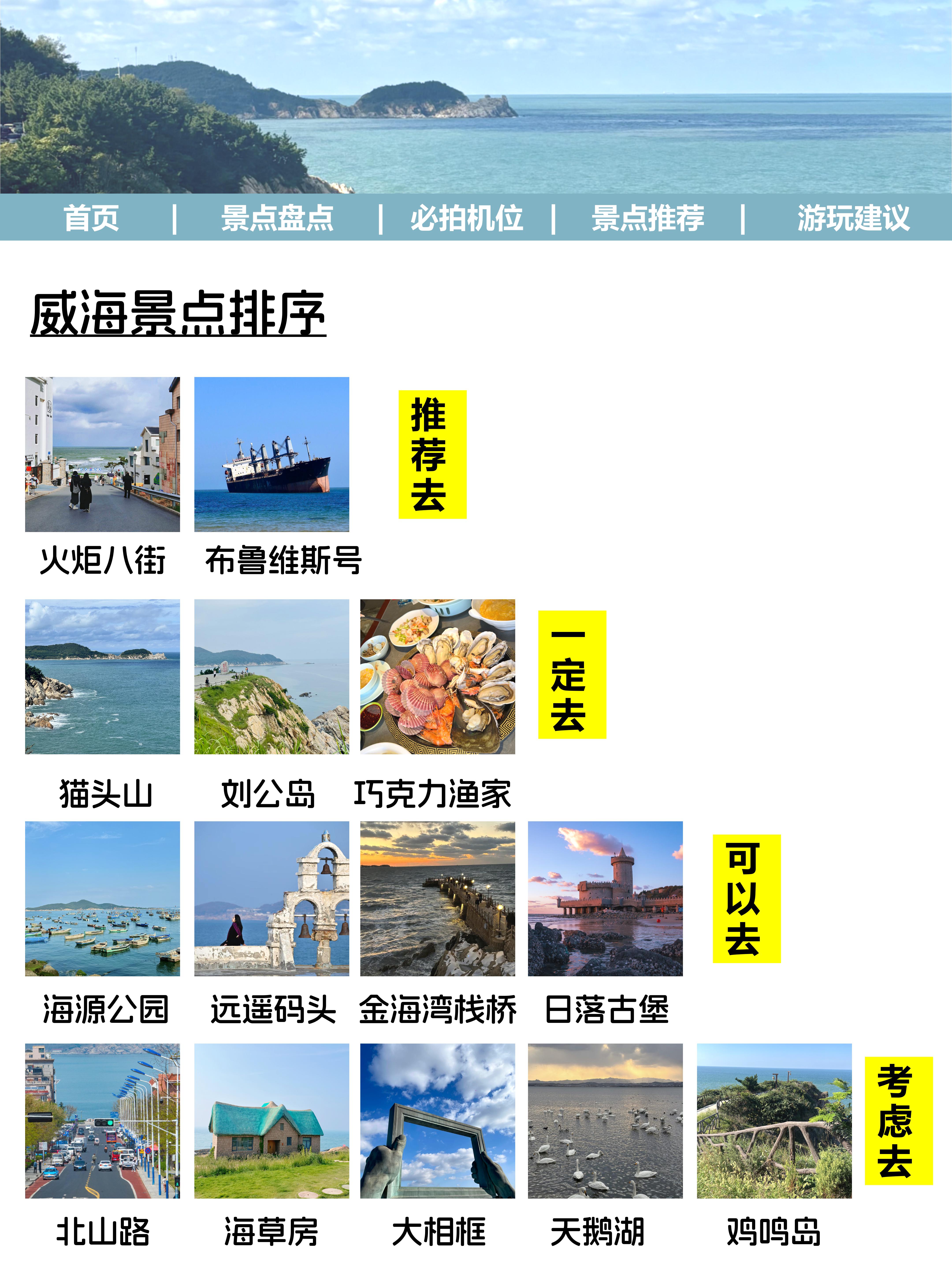 上午:去刘公岛。这是威海的历史课,坐船上岛看甲午战争博物馆,心情会变沉重。关键:一定提前查天气,风大就停航!