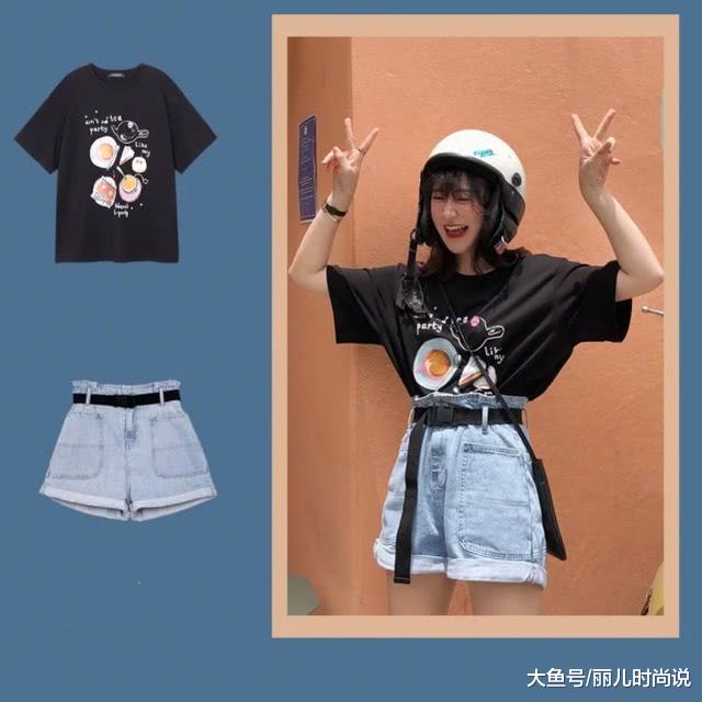 夏日很潮的一套少女街头风穿搭,我个人特别喜欢这条牛仔短裤,上面配着的腰带显瘦又好看,上衣是一件黑色短袖t恤,酷酷的很有范,t恤全部塞进裤子里面,这样就更显高挑,矮个子女生照着这样穿很合适。
