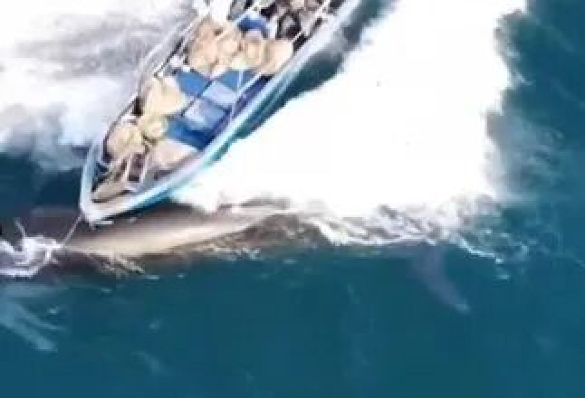 2月7日,广西北海。有网友发布视频,在涠洲岛海域,一艘渔船直接从一头布氏鲸身上开过,造成出水换气的鲸鱼背部受伤,伤痕明显。