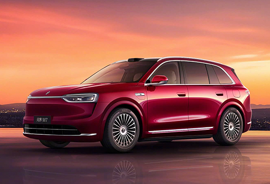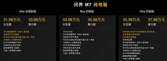 动力方面,全新问界M7提供纯电动和增程式两种配置选择。其中,纯电版车型搭载华为DriveONE高压碳化硅七合一电驱,分为单电机和双电机两个版本,匹配三元锂电池组,根据配置不同,CLTC纯电续航里程分别为660km和710km。增程版车型搭载1.5T发动机,最大功率118kW,CLTC纯电续航里程为315km。