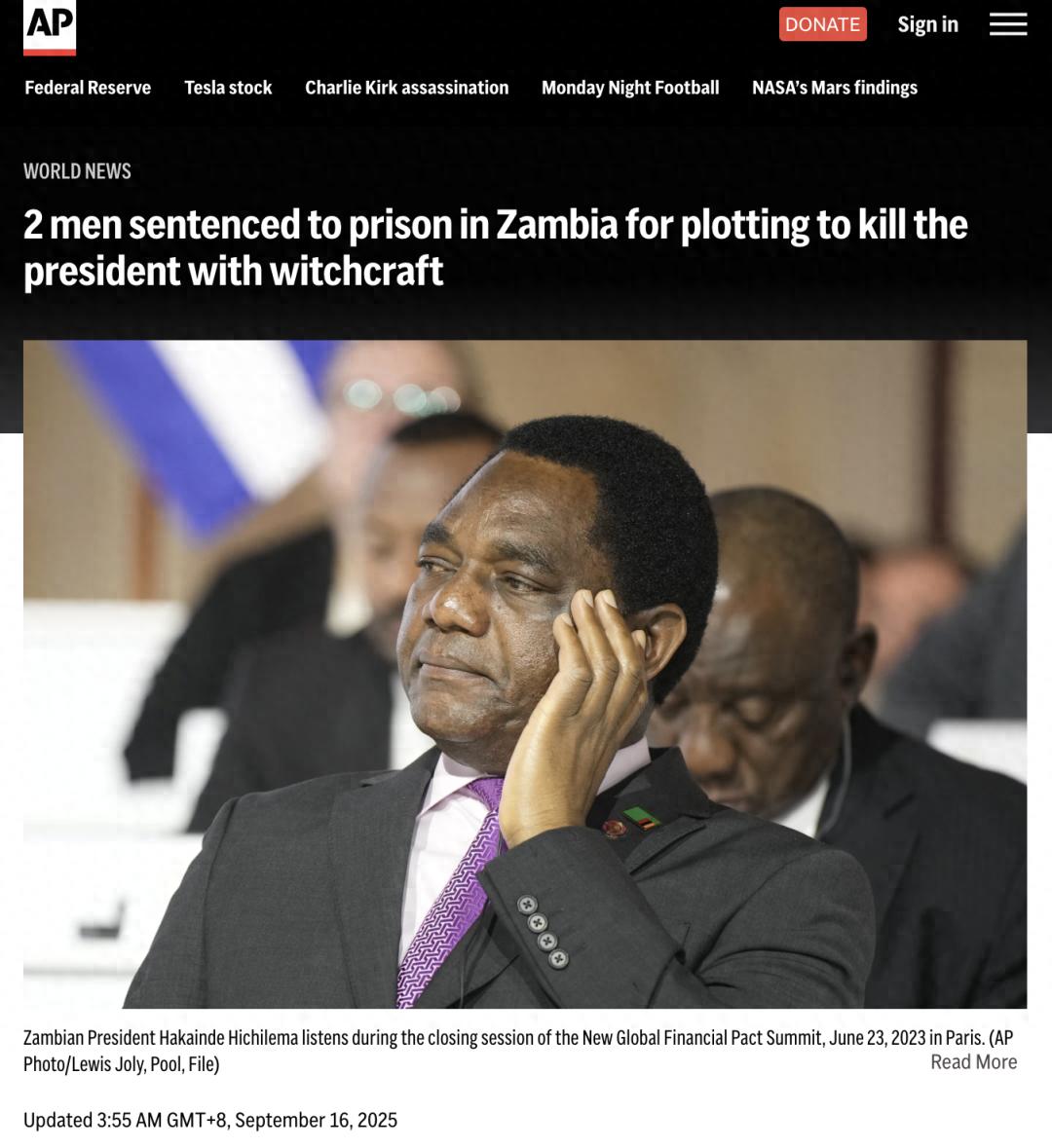 据美联社报道,赞比亚地方法院当地时间15日判处两名男子两年有期徒刑并服苦役,罪名是企图使用巫术谋杀总统。这两名分别来自赞比亚和莫桑比克的嫌犯于上周依据赞比亚在殖民时期制定的《巫术法》被定罪。