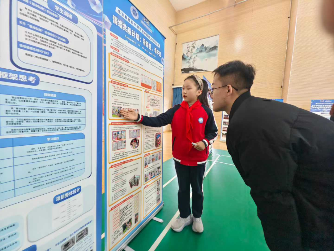 活动伊始,教育实验成果展示交流环节率先拉开帷幕。各实验学校的师生代表通过丰富的可视化作品,生动呈现了教学改革、课程创新等领域的实验探索,为现场带来了兼具创意与实效的实践案例。北京教育科学研究院附属顺义实验小学的师生代表也带来了学校项目式学习的精华成果,其设置的三个展台前,参观者络绎不绝。