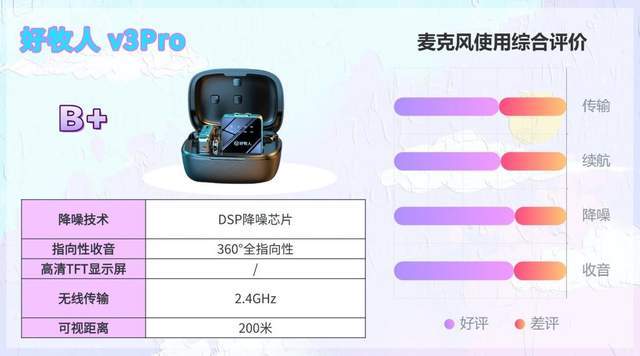 综合实力评价:适配多数手机、相机,即插即用,多人拍摄搭配起来很灵活。200米内移动拍摄信号都稳定,传输特别可靠。发射⑦单次续航27小时,搭配充电盒总续航54小时。