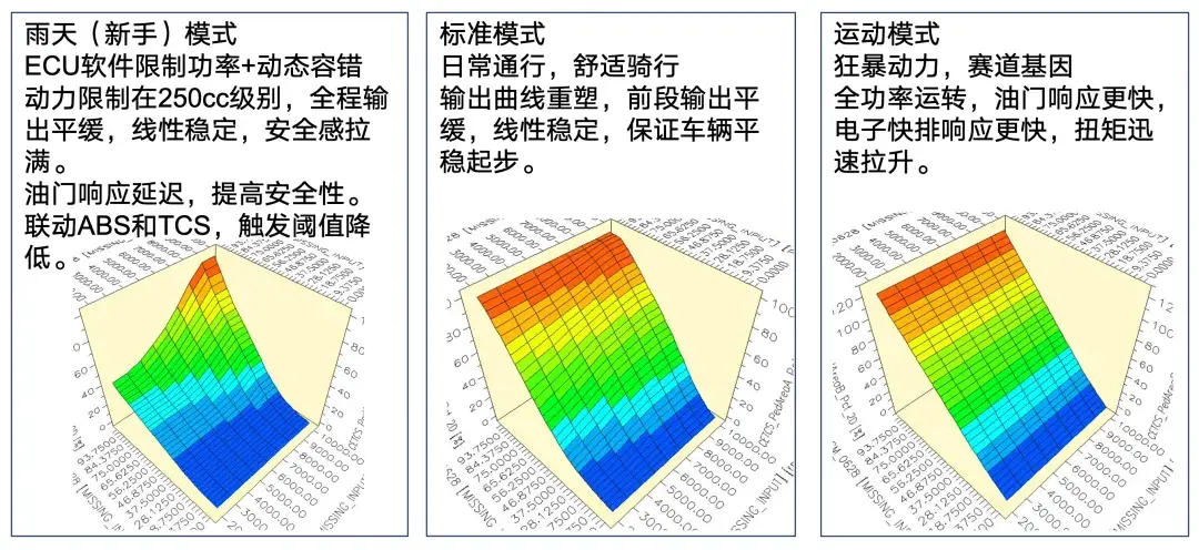 首先是“新手模式”,相当于许多进口车型上的“雨天模式”。在该模式下,ECU会将动力输出限制在约250cc级别的水平,油门响应变得平缓,ABS和TCS介入也更积极,对新手的容错率大大提升。