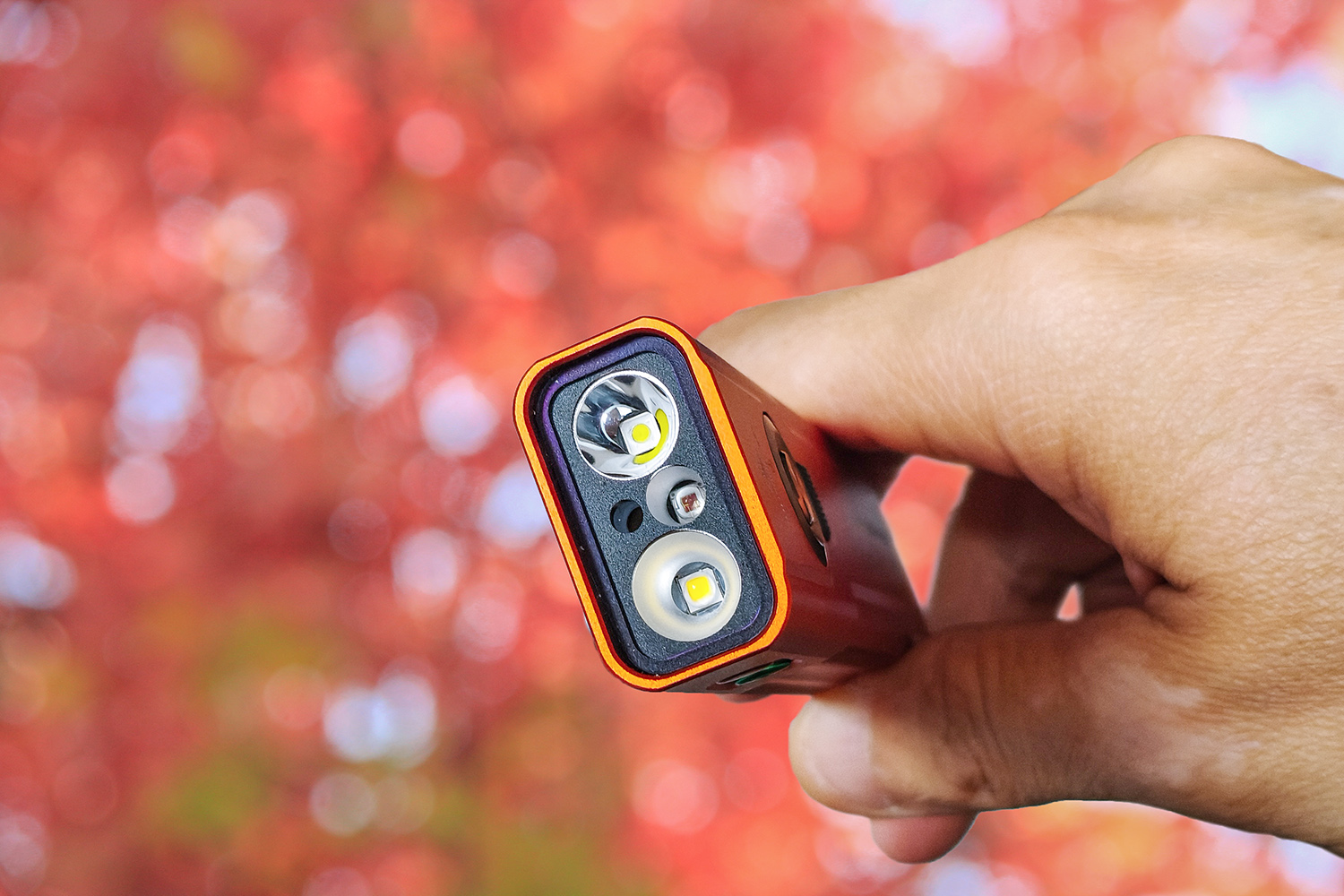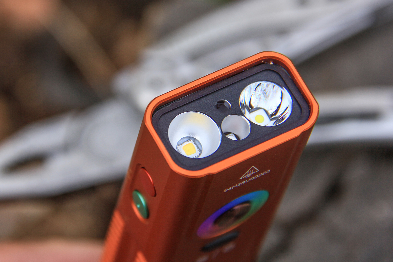E06R Pro RG的主灯由LUMINUSS提供,一颗为SST20、另一颗是SFT25。其中,SFT25 为小面积圆形LED,负责聚光,光束集中穿透力强,适配远距搜索;SST20面积稍大带有果冻,主打泛光,光线柔和均匀,近距照明更舒适。
