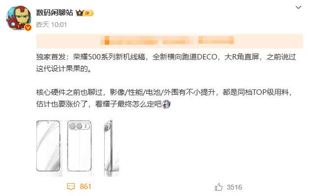 近日,知名博主@数码闲聊站 爆料了荣耀500的线稿图,并配文如下:“独家首发:荣耀500系列新机线稿,全新横向跑道DECO,大R角直屏,之前说过这代设计果果的。核心硬件之前也聊过,影像/性能/电池/外围有不小提升,都是同档TOP级用料,估计也要涨价了,看耀子最终怎么定吧”。