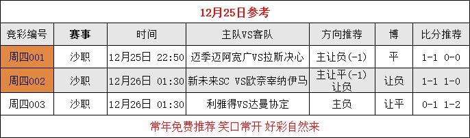 利雅得新月:4-3-3达曼协作:5-4-1比赛时间:2025年12月25日 20:00(沙特时间)足球的奇迹,永远留给那些相信奇迹的人。让我们拭目以待。