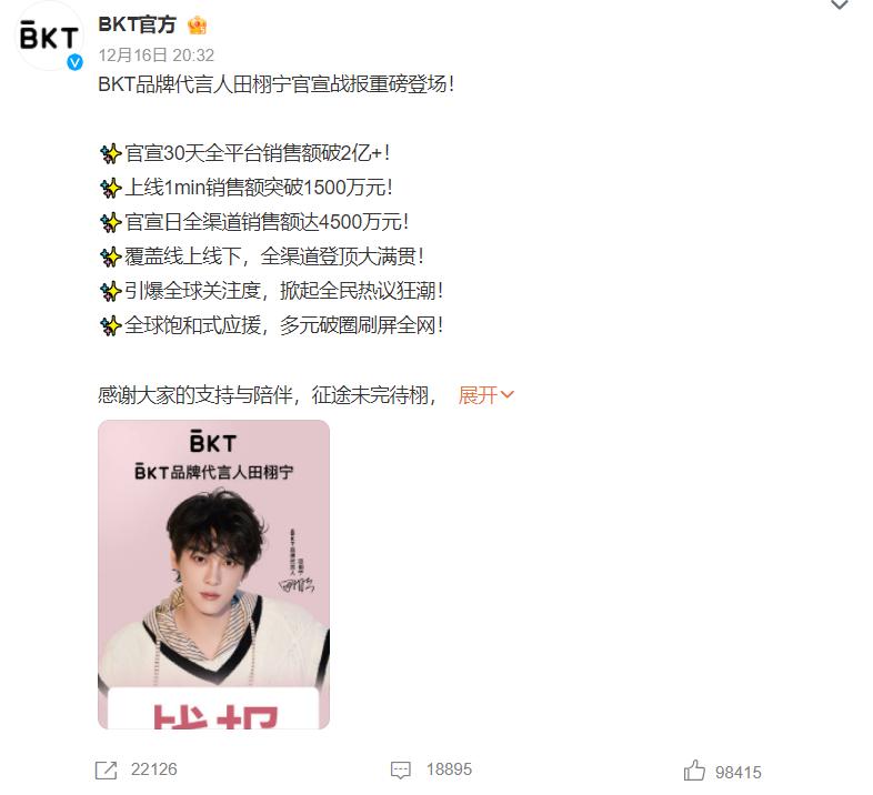 相比之下,田栩宁就显得比较低调了,他先进组拍摄《七月的一天》,这部剧杀青后,田栩宁并没有进组,而是接活动,前不久,田栩宁参与直播活动,然后“田栩宁全平台销售额破2亿”话题登上热搜,从官方发出的战报上看,官宣30天全平台销售额已经达到2亿+,这样的带货能力,是很多顶流都不具备的。
