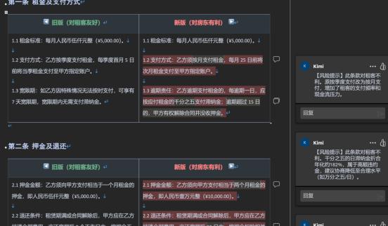 我上传了两份模拟的房屋租赁合同(一份旧版、一份新版,新版在押金退还、违约责任上做了手脚),让 Kimi 帮我对比并输出 Word。