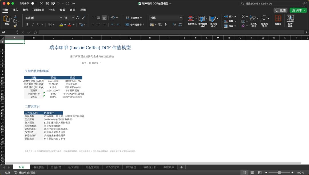 任务:用 DCF 法对瑞幸咖啡进行估值,输出完整的 Excel 模型。