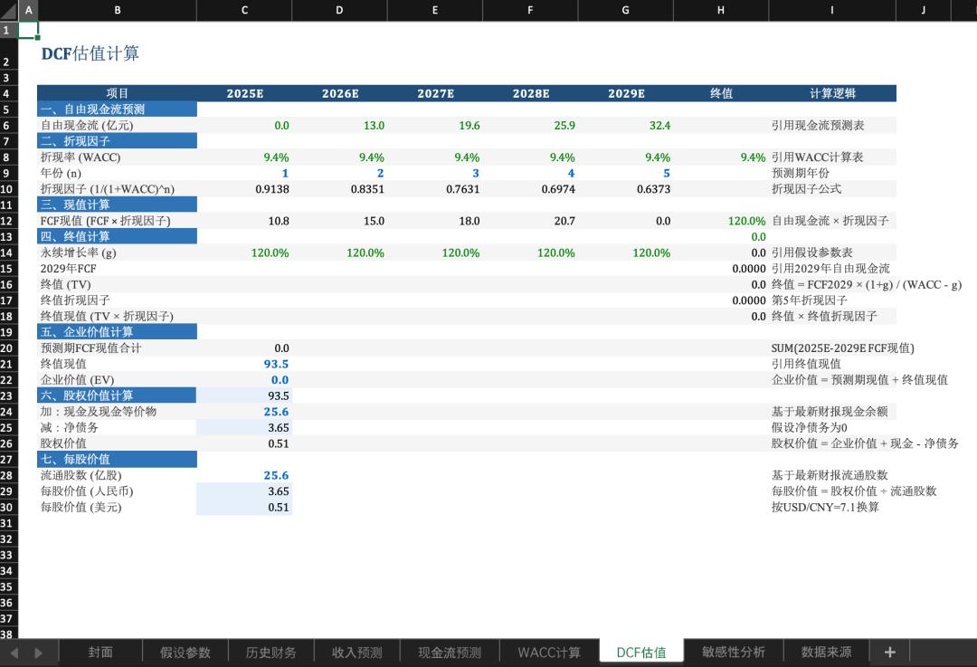 这事我自己肯定做不了。DCF(现金流折现)是金融分析的基本功,但对普通人来说,光理解WACC、终值这些概念就够喝一壶的,更别说动手建模了。