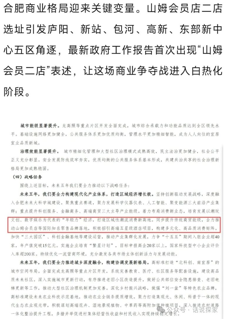 合肥山姆会员店二店选址引发庐阳、新站、包河等多个区域争抢,而且在最新政府工作报告首次出现“山姆会员二店”表述。