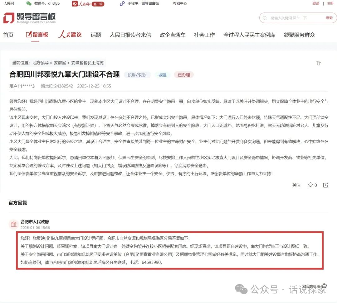 近日,有网友在人民网领导留言板反映合肥四川邦泰悦九章大门建设不合理问题,官方回复来了!