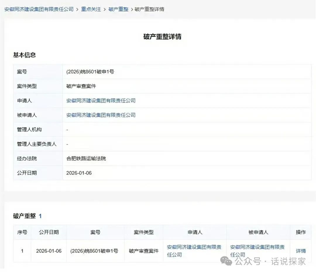 万万没想到,拥有特级资质的安徽同济建设集团有限责任公司,终究还是没能撑过这个冬天,于1月6日申请破产重整了,由合肥铁路运输法院经办。