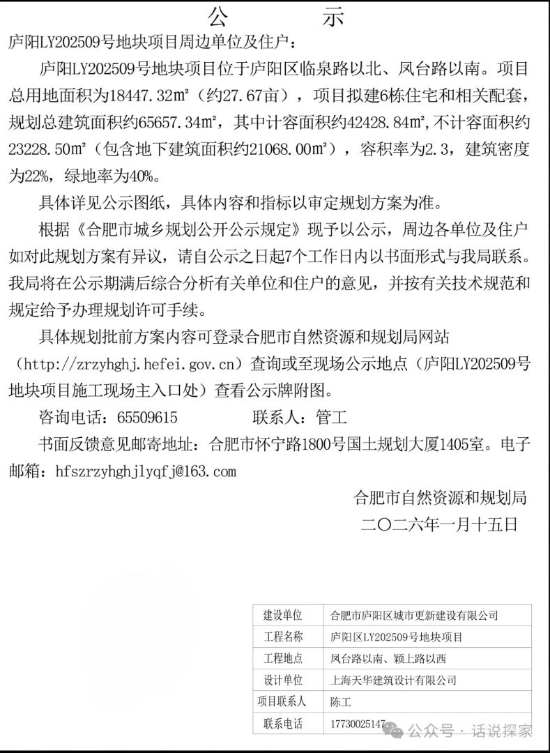 庐阳城市更新LY202509号地块规划方案公示,项目位于庐阳区临泉路以北、凤台路以南,总用地面积为18447.32m(约27.67亩)。