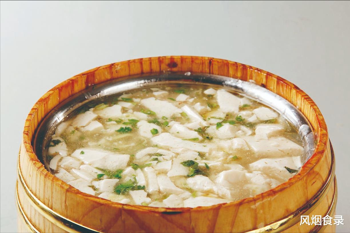 豆腐选淮安本地黄豆,经石磨研磨、盐卤点浆,切成雀舌形,配海参、虾米、香菇丁,用老母鸡汤煨透,勾薄芡后淋麻油,撒青蒜末。