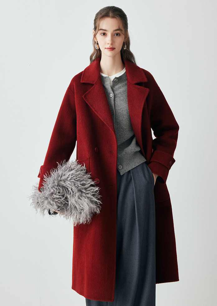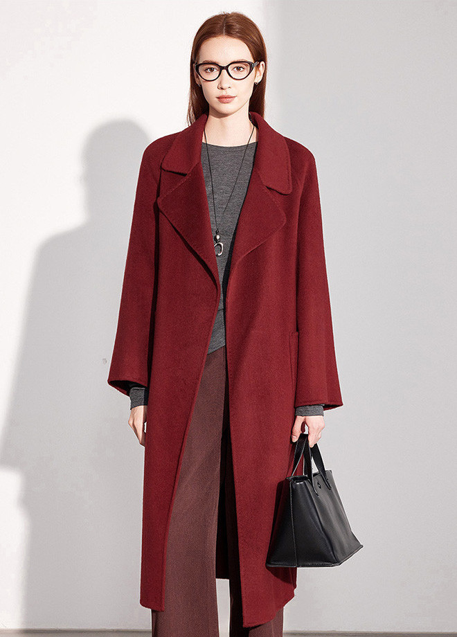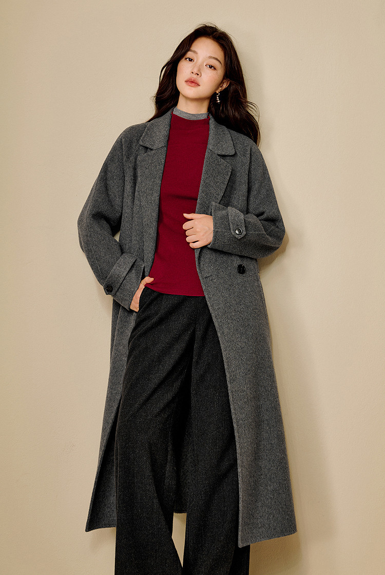 红色廓形大衣 + 灰色阔腿裤 + 灰色打底 ,大衣廓形设计对身材包容性强;灰色阔腿裤垂坠感十足,能平衡大衣的厚重感,还能拉长腿部线条。