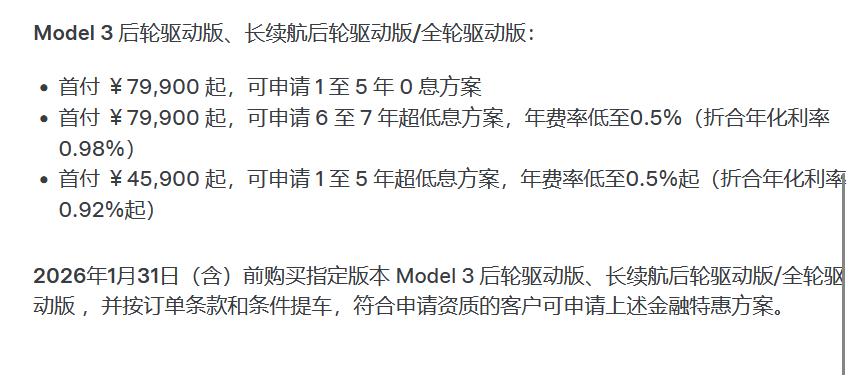 特斯拉开年就王炸,但不是直接优惠在车价,而是选择在分期上下手,直接推出了5年0息方案,像model3和modelY做5年0息,最低首付仅需7.99万元,也有6-7年的超低息方案,年费率仅0.5%。印象中编辑做4S店那会,新车正常贷款只能分4年,通常年费率都在3%左右,虽说近年消费贷方面利息下降,但特斯拉这波也太狠了,估计能吸引不少年轻人和需要流动资金的小本经营者。