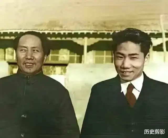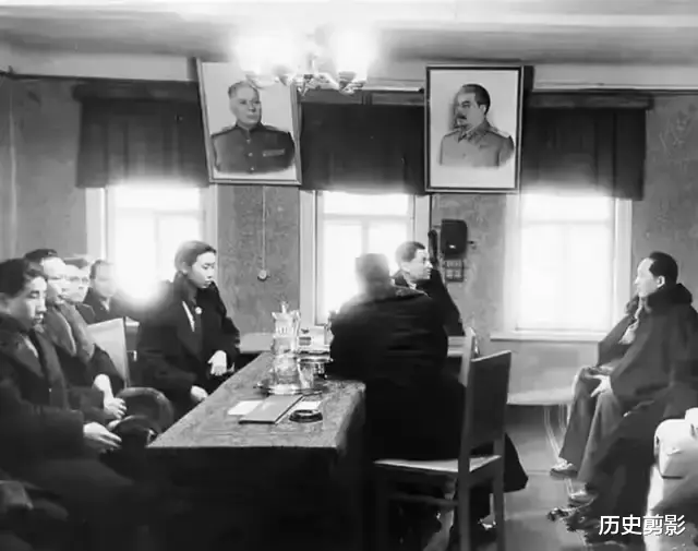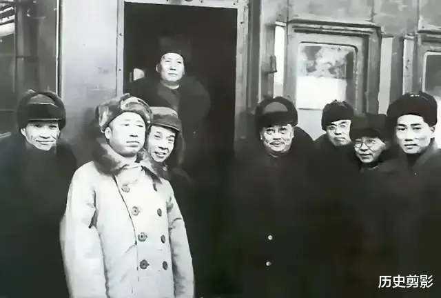 1949年12月9日,毛主席前往苏联访问到满洲里火车站,登上苏联机车和送行人员交谈,左一为毛岸英。