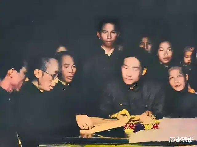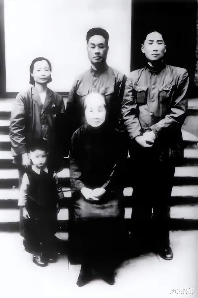 毛岸英(右)1950年回湘时与外婆(前)、舅舅杨开智、舅妈李崇德、表妹杨瑛的合影。