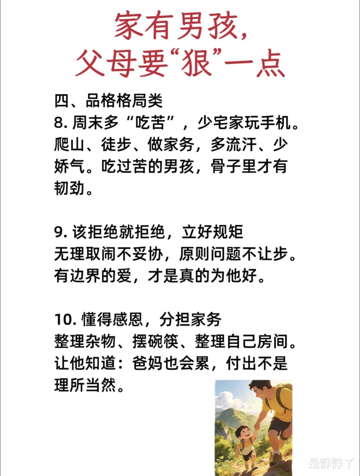 真正的爱,不是把孩子养在温室里,而是让他在风雨中学会坚强。父母的“狠”,不是不爱,而是更爱——爱到愿意放手,爱到愿意看他跌倒,爱到相信他能自己爬起来。这种“狠”,才是男孩成长路上最珍贵的礼物。