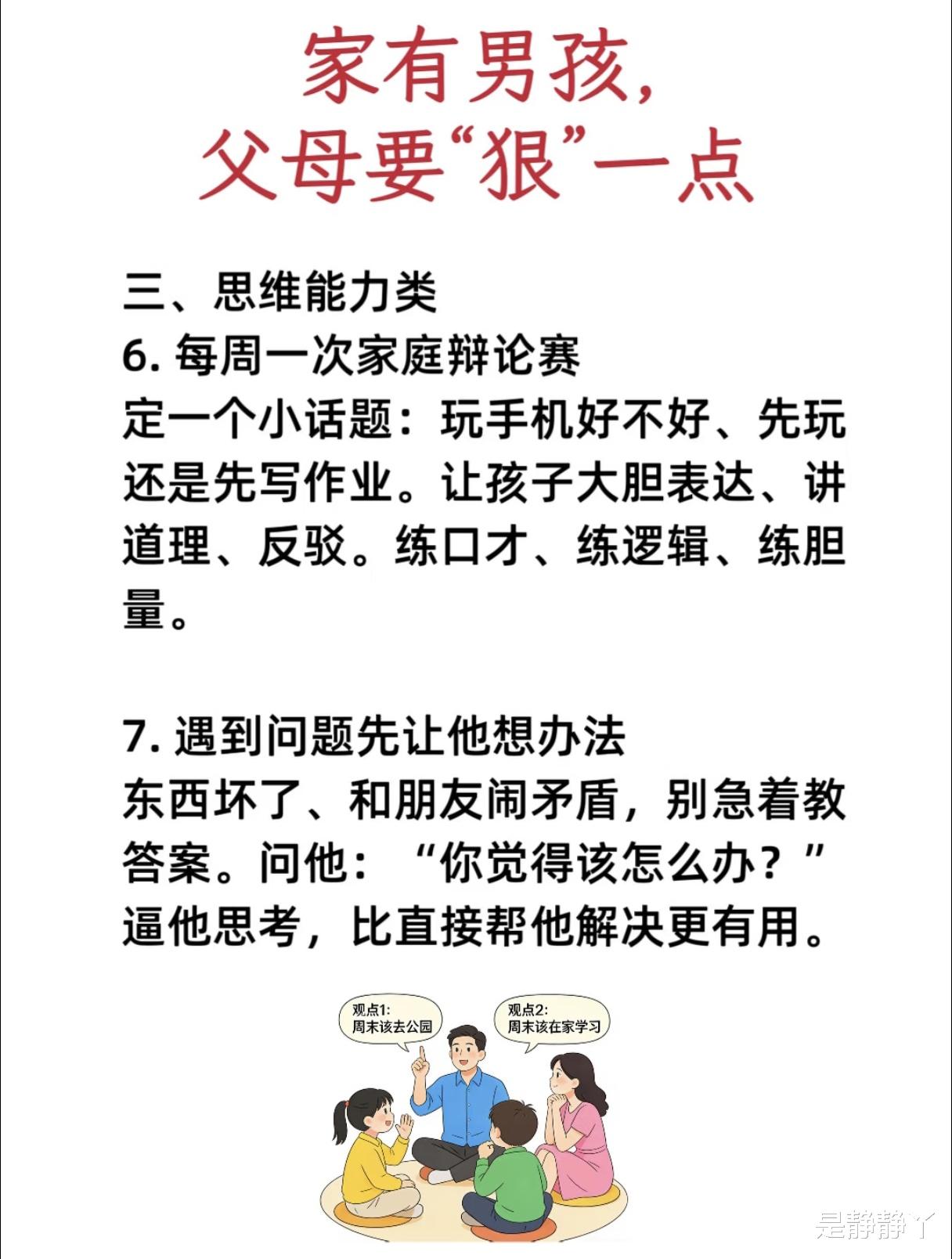真正的“狠”,是逼孩子思考,而非替他解决问题。东西坏了?别急着修;和朋友吵架了?别急着调解。问他“你觉得该怎么办”,把问题抛回给孩子。每周可举行家庭辩论赛,如“玩手机好不好”“先玩还是先写作业”。鼓励孩子大胆表达,学会讲道理、反驳。这种思维训练,比死记硬背更有用。孩子学会思考,人生就有了方向。