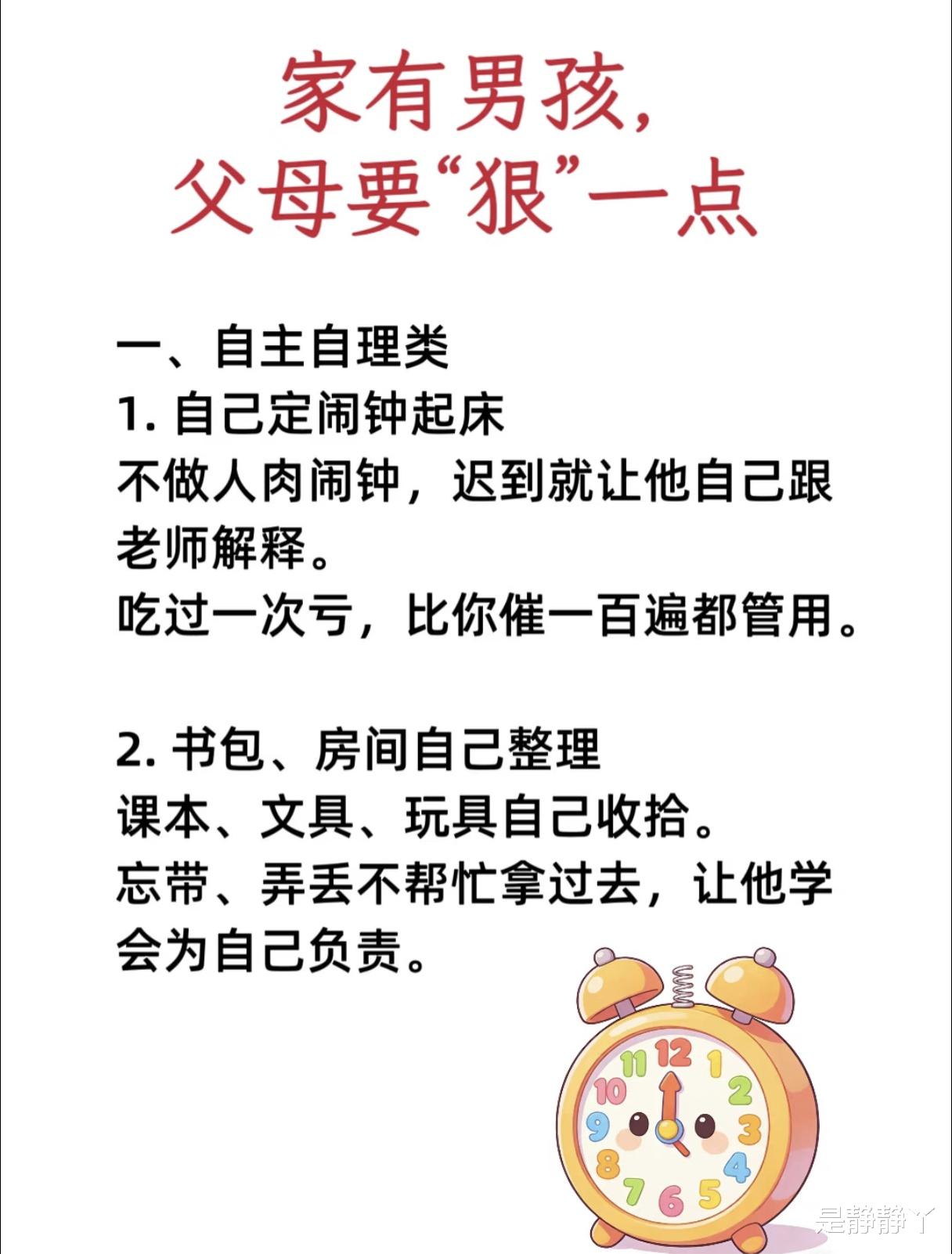 这种“狠”不是冷漠,而是把成长主动权还给孩子。比如,让他自己定闹钟起床。很多妈妈习惯当“人肉闹钟”,反复叫孩子,结果孩子习惯等待,直到迟到被批评才醒悟。这种“吃亏”比妈妈催一百遍都有效。书包忘带?玩具丢了?别急着送过去,让他自己跟老师解释。当孩子红着脸对老师承认“我忘了”时,这种羞愧感会成为深刻教训——自己的疏忽要自己承担后果。