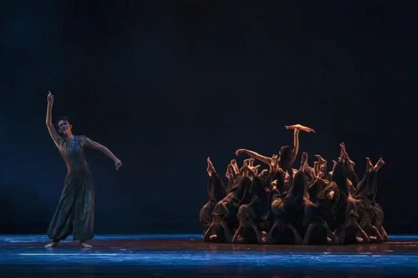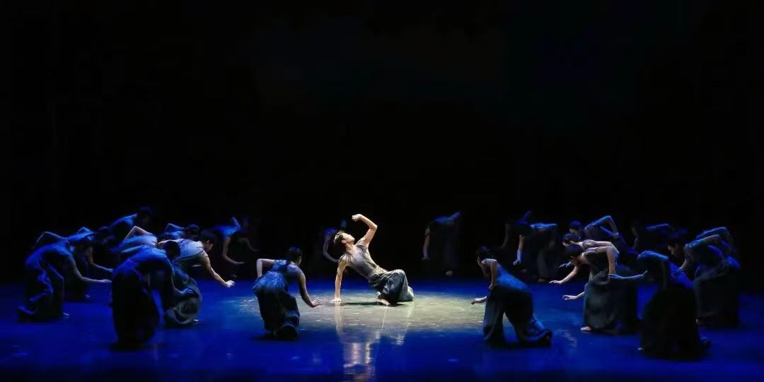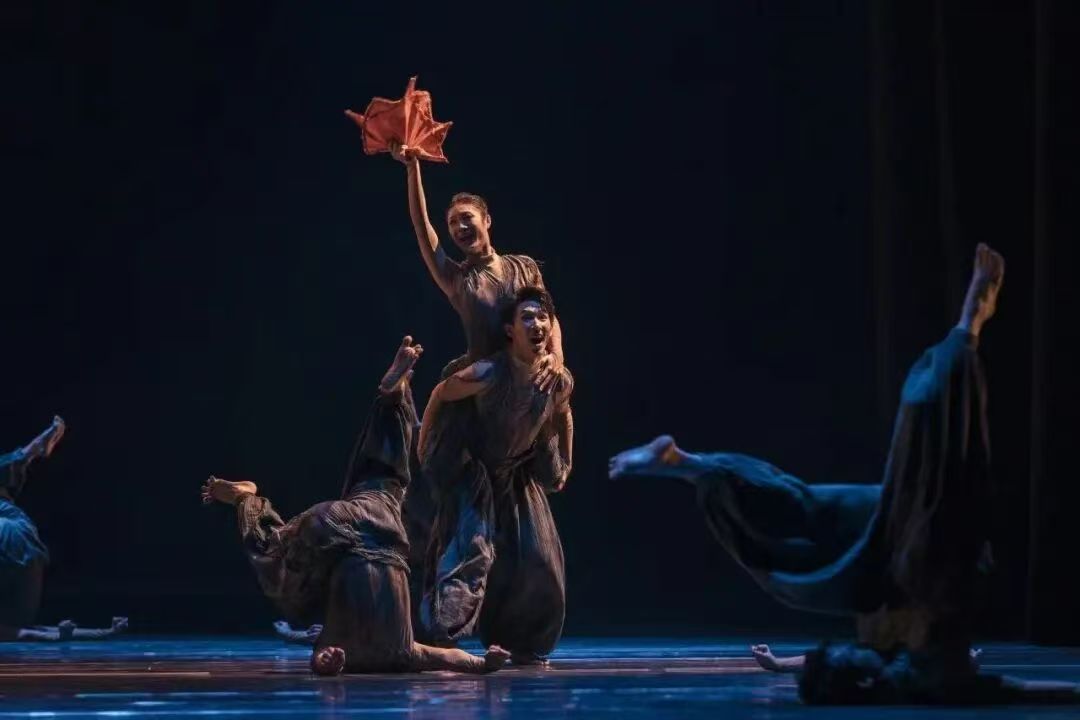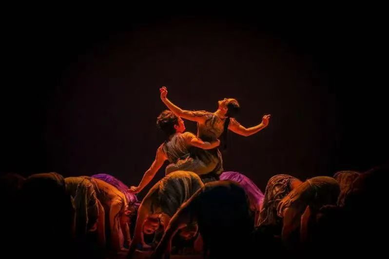 《再望这片黑土》选择广为人知的“黑土地”作为情感意象的寄托,却没有停留在单一的乡愁叙事,而是将其作为一种始终在场的“根基”存在,从“再望”这一当下视角出发,层层讲述人与土地之间相互凝视的情感联结。作品中,身体语言是对“重力感”的自觉经营,舞者的重心向下,足部的顿、踢,并不是为了强化民间风格的“味道”,而是让每一次着地都寓意着一次“栽种”,与看不见的根须暗自相连;舞者上身的动作则是在这种下沉基础上的延展与牵引,通过营造出一种“厚土起伏”的视觉节奏,展现出一种“生命涌动”的情感感受。